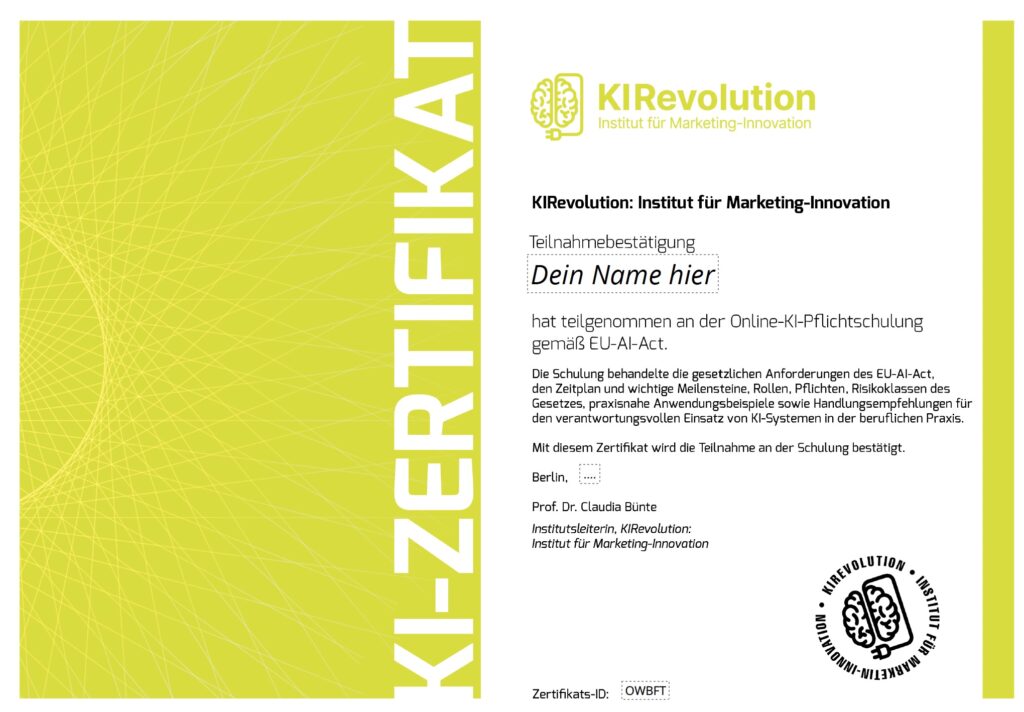 - Für Marketing + Vertrieb: https://kirevolution.com/veranstaltung/online-kurs-ki-pflichtschulung-fuer-marketing-und-vertrieb