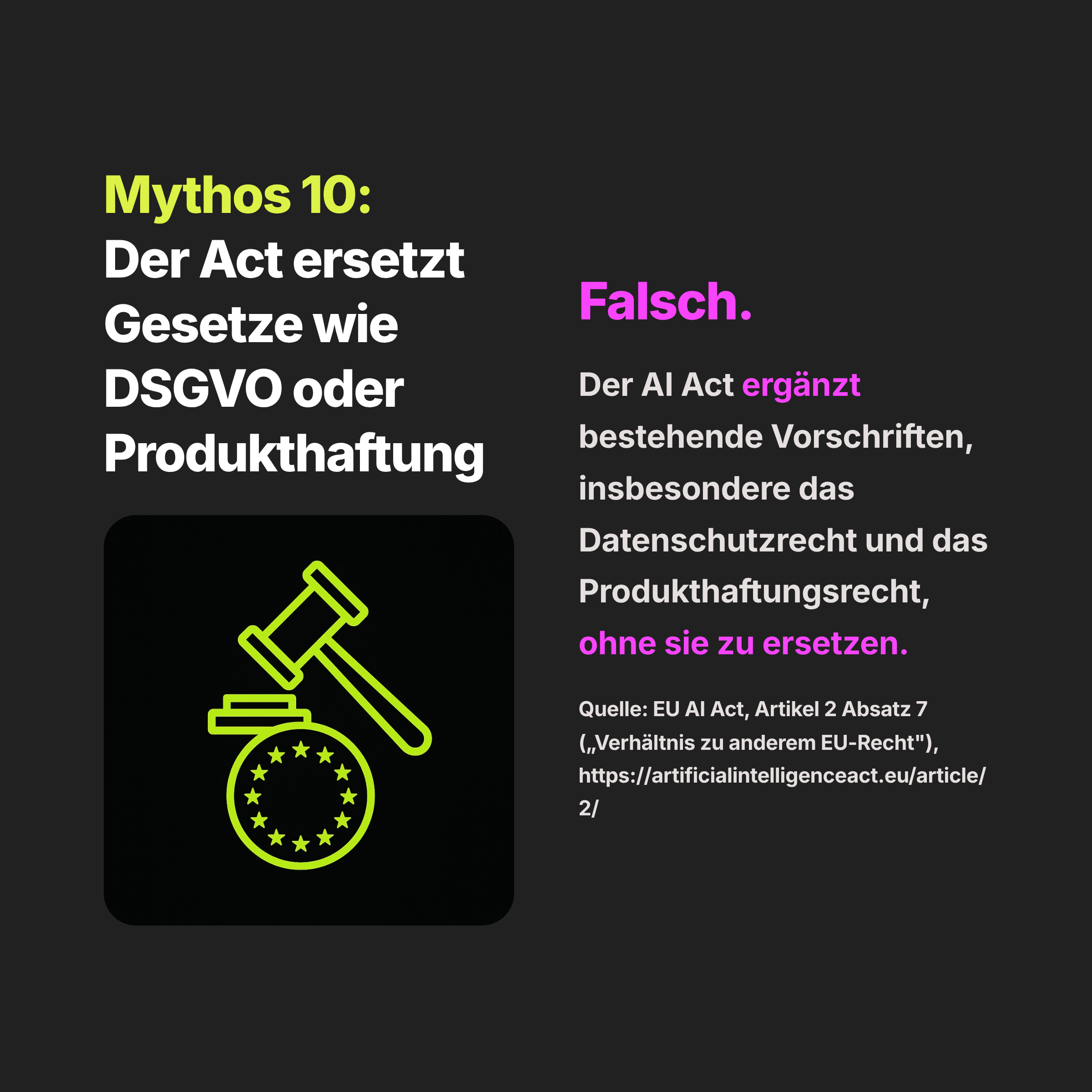 Mythos 10: Der EU AI Act ersetzt bestehende Gesetze wie DSGVO oder Produkthaftung.