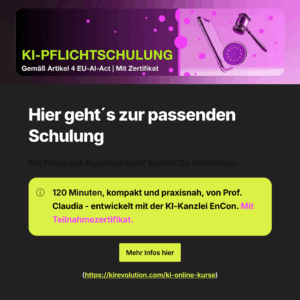 - Für Agenturen: https://kirevolution.com/veranstaltung/online-kurs-ki-pflichtschulung-fuer-agenturen