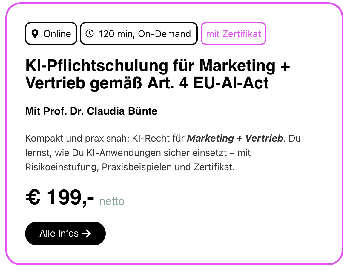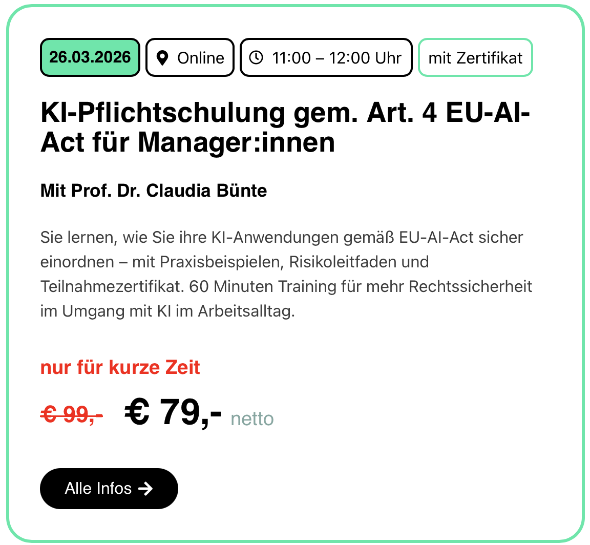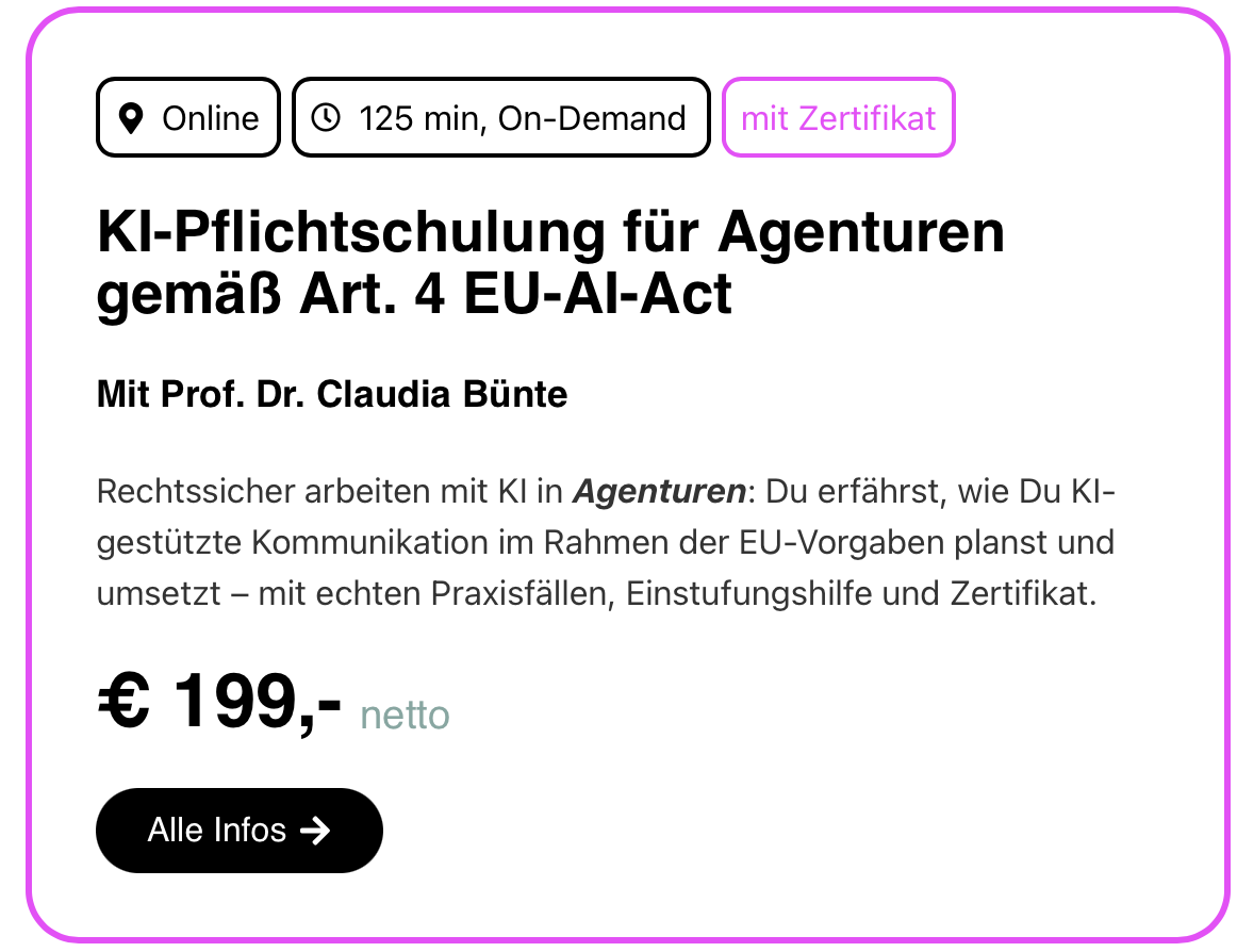 Und Du? Arbeitest Du beruflich mit KI? Fehlt Dir noch der EU-Nachweis für die Pflichtschulung? Dann geht’s zur praxisnahen Kurzschulung mit Zertifikat