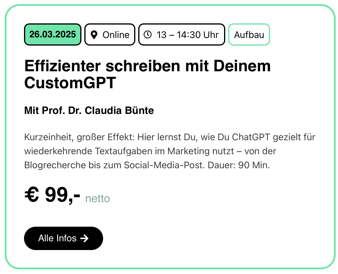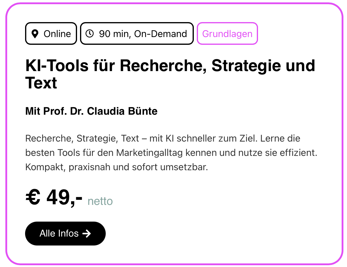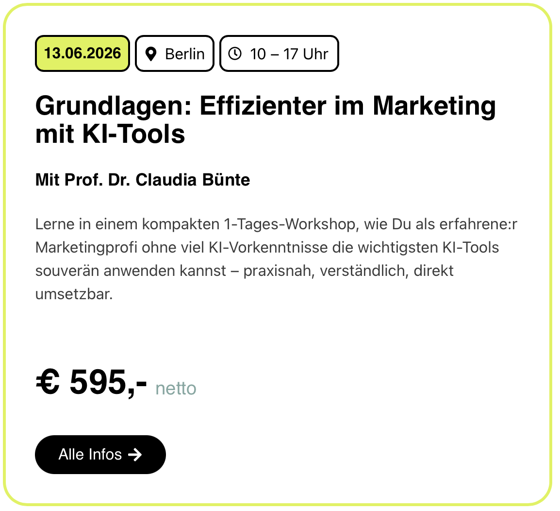 HIER kannst du Deine KI-Kompetenzen praxisnah stärken: Unsere Online-Kurse, Masterclasses, Webinare und Inhouse-Schulungen sind genau darauf ausgerichtet – individuell, von Praktikern für Praktiker und auf Marketing fokussiert: KIRevolution Leistungen