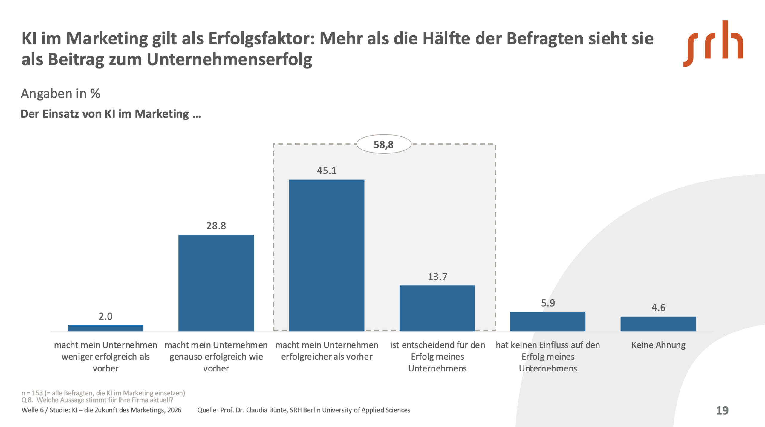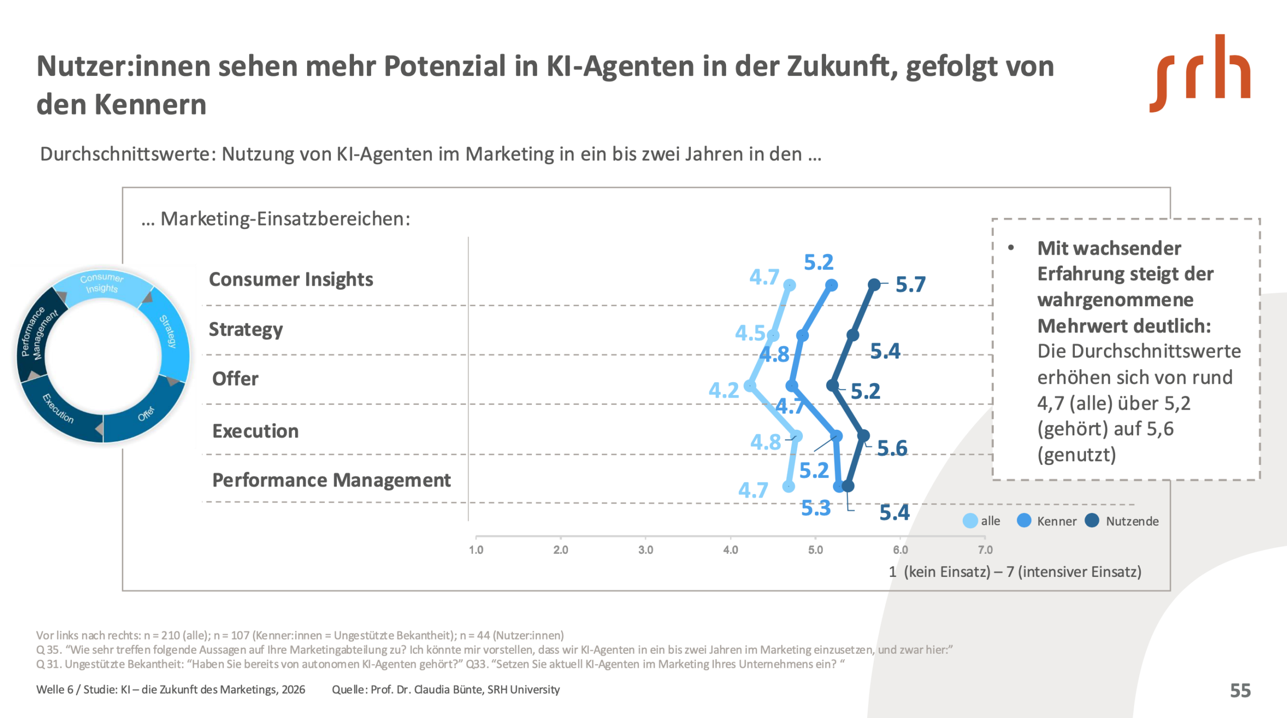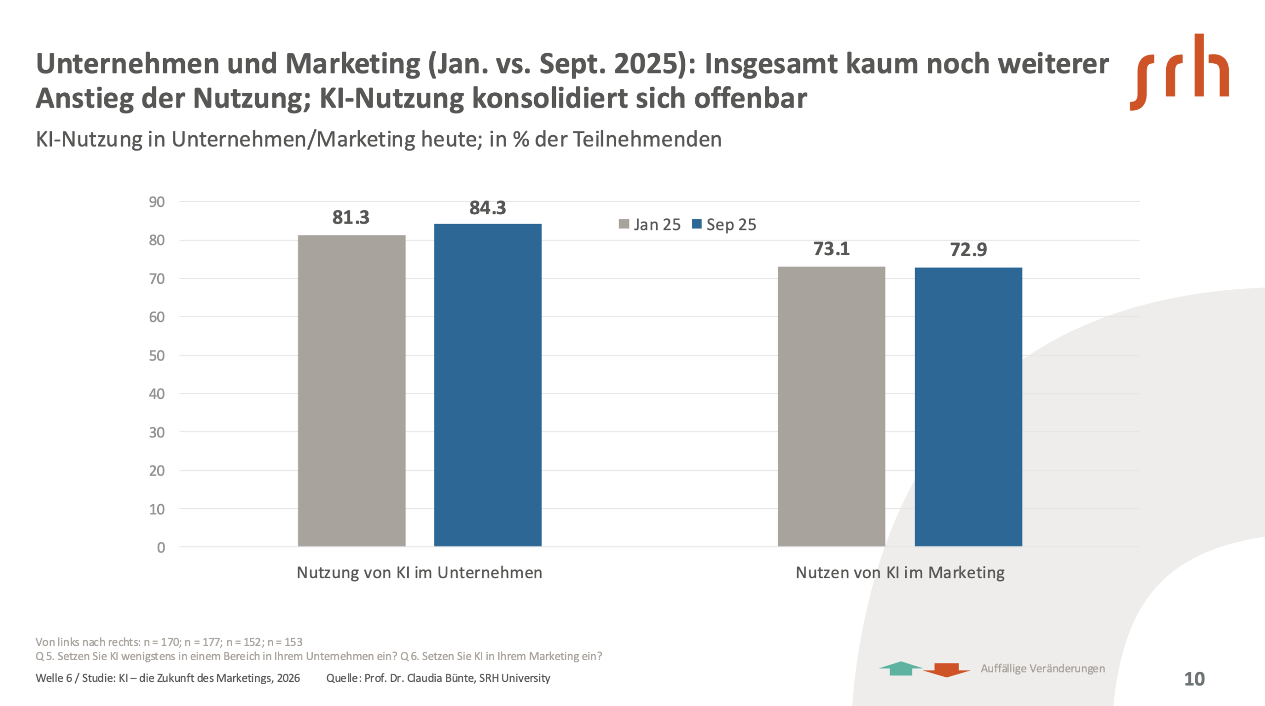 Berlin, Januar 2026 – Die sechste Welle der Langzeitstudie „KI – die Zukunft des Marketings“ zeigt ein klares Bild: KI ist im Marketing angekommen. Die Nutzung ist hoch, erreicht 2026 aber ein Plateau. Gleichzeitig sinkt das Vertrauen in KI-Ergebnisse, die Skill-Lücke der Anwendenden bleibt groß und fast ein Viertel des Potenzials bleibt daher ungenutzt. Das ist kritisch – denn die neu aufkommenden KI-Agenten entscheiden selbstständig. Falsch genutzt, ist das ein Risiko. Gleichzeitig fordert die KI-Verordnung der EU, dass Anwendende von KI ausreichend geschult sind. Und auch das ist nur einem Teil der Befragten bekannt. So die Ergebnisse der neuesten Welle zu KI im Marketing.