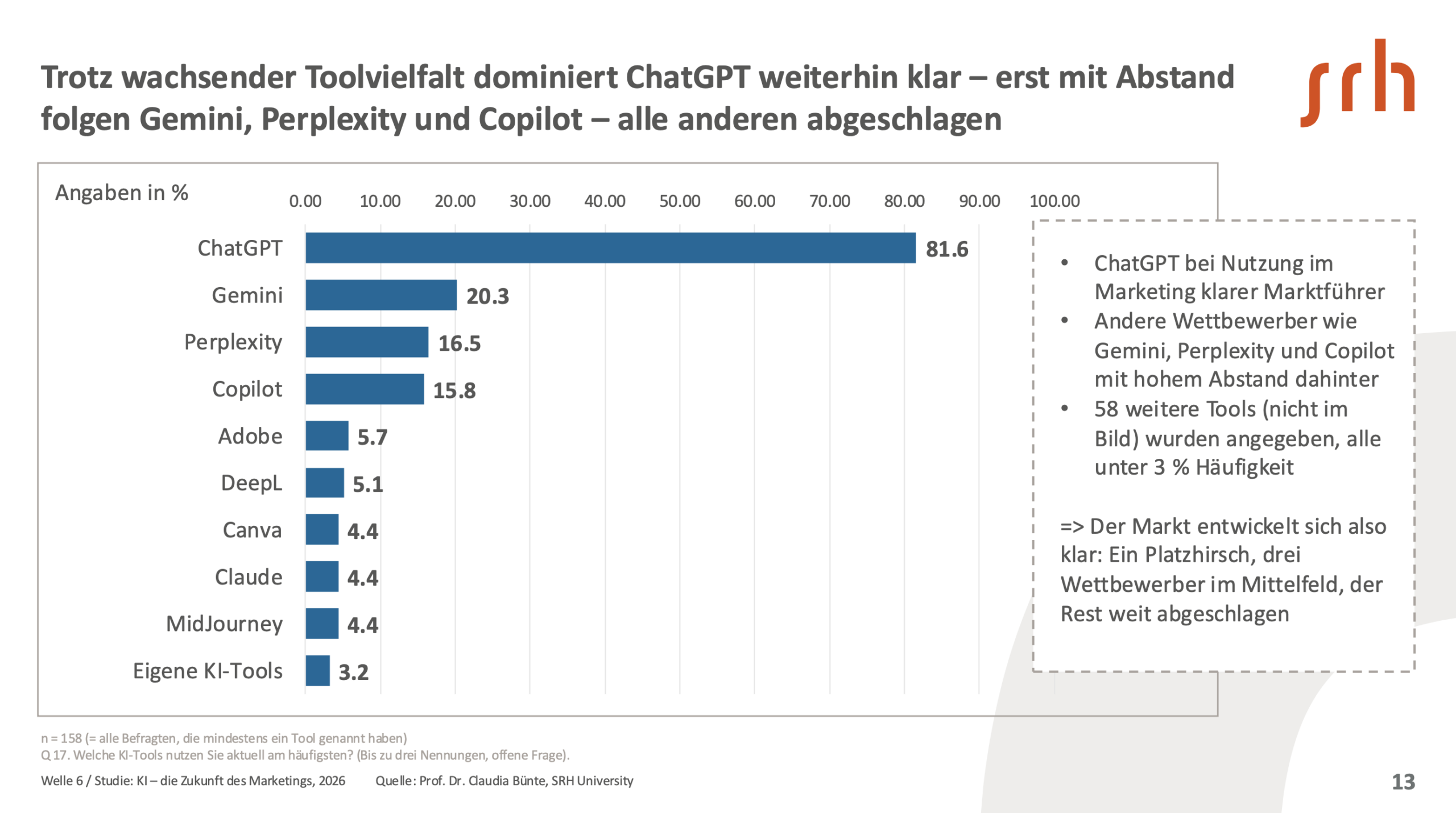 KI ist längst Standard in Wirtschaft und Marketing: 84,3 % der Unternehmen und 72,9 % der Marketingabteilungen setzen sie ein. Im Vergleich zu 2018 entspricht das einem Zuwachs von rund 175 %. Neu ist allerdings: Zwischen Januar und September 2025 zeigt sich kaum weiteres Wachstum – die KI-Nutzung konsolidiert sich offenbar. Parallel dazu konzentriert sich der Einsatz trotz wachsender Toollandschaft auf sehr wenige Anwendungen. ChatGPT dominiert mit über 80 %, gefolgt von Gemini, Perplexity und Copilot mit zwischen 20 und 16 %, während andere Tools kaum genutzt werden.