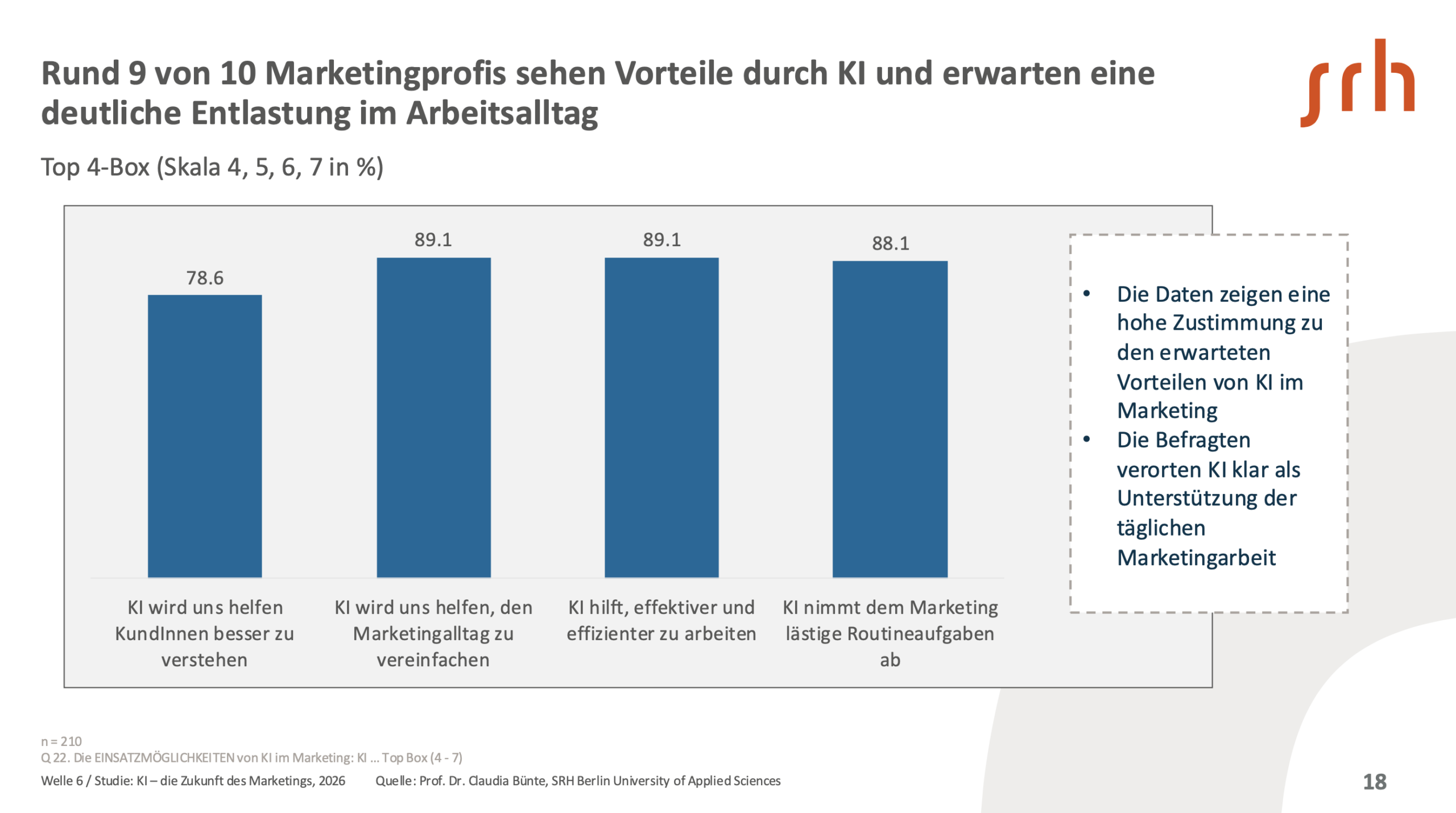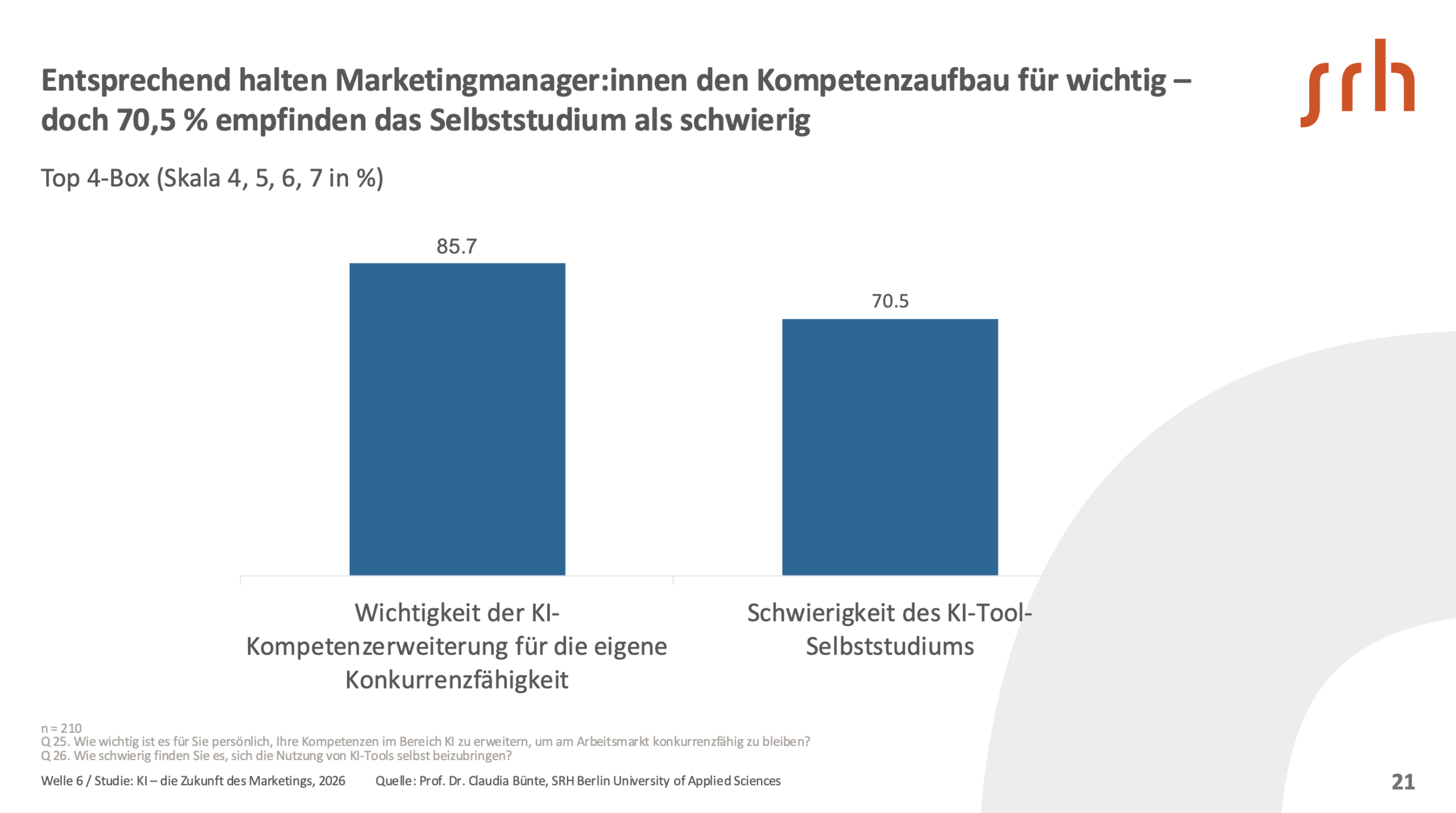 Die Vorteile von KI werden von Marketingverantwortlichen klar gesehen: Rund neun von zehn erwarten spürbare Entlastung im Arbeitsalltag, mehr als die Hälfte bewertet KI bereits als Beitrag zum Unternehmenserfolg, und eine deutliche Mehrheit sieht Auswirkungen auf die Wettbewerbsfähigkeit. Gleichzeitig wächst der Lernbedarf schneller als die Fähigkeit, ihn zu decken. Fast 86 % halten den Ausbau ihrer KI-Kompetenzen für wichtig, doch rund 71 % empfinden das Selbststudium als schwierig.