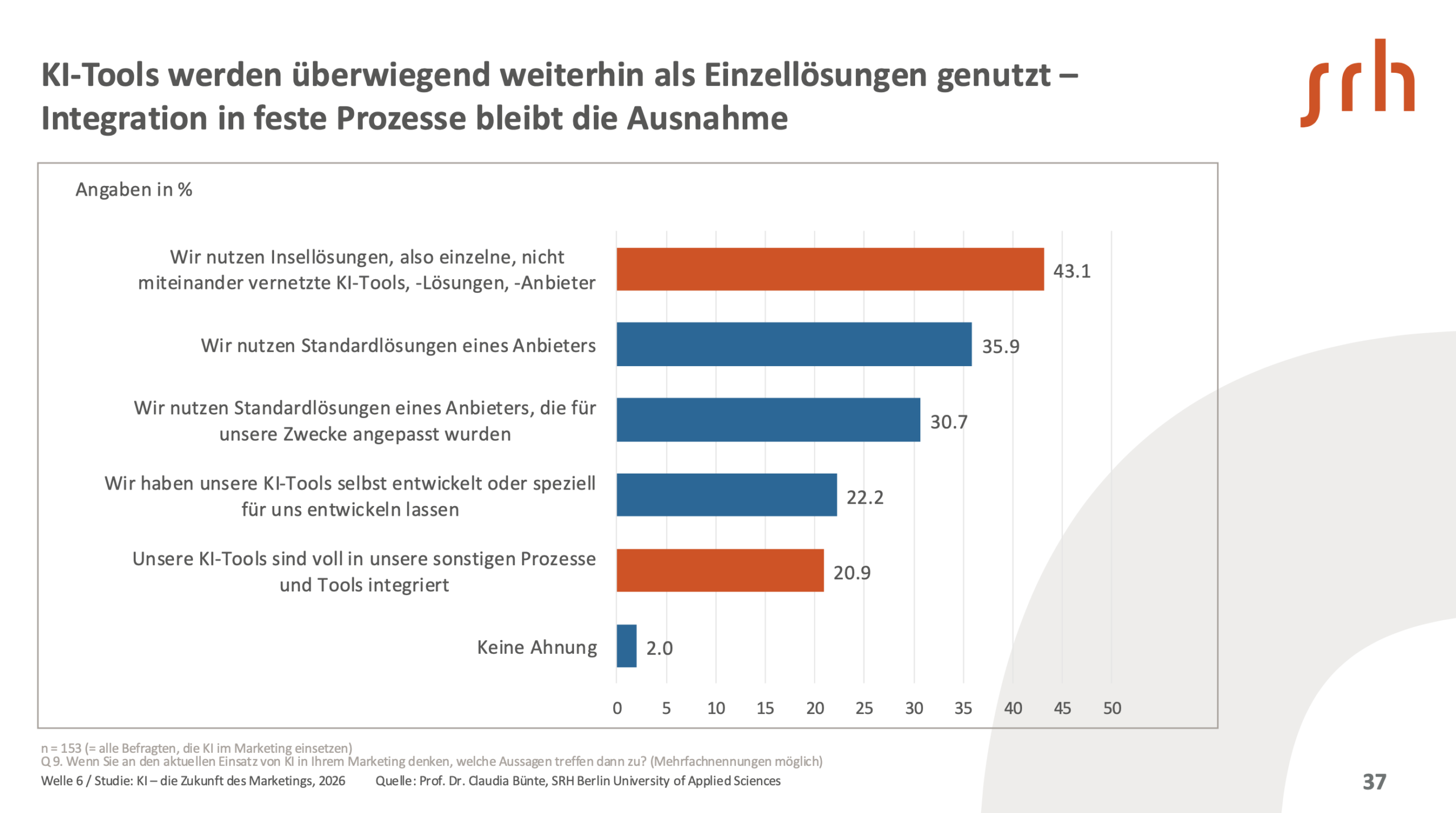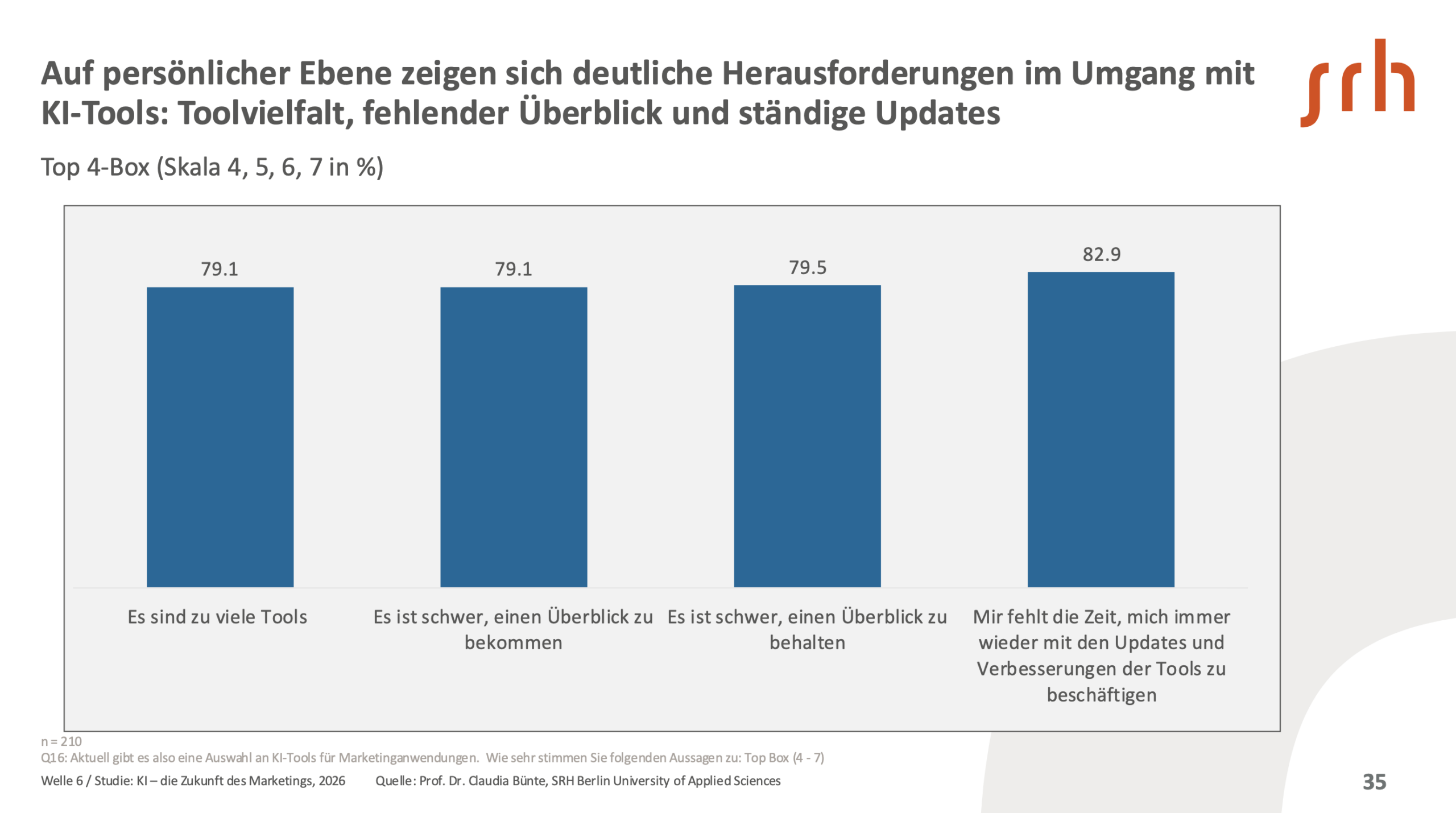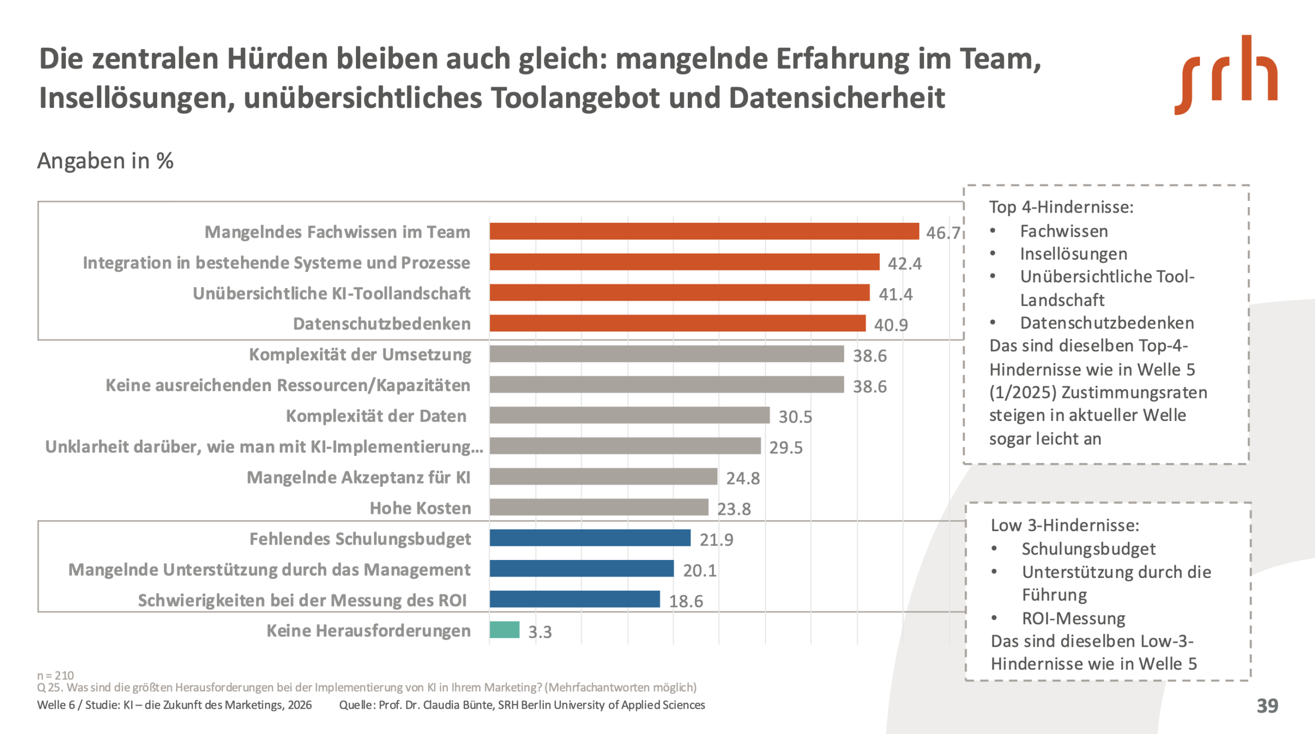 Rund drei Viertel der Befragten fühlen sich durch Toolvielfalt, fehlende Orientierung und ständige Updates überfordert. Der KI-Einsatz erfolgt überwiegend in Form isolierter Einzellösungen; eine systematische Integration in bestehende Prozesse ist weiterhin die Ausnahme. Fehlende Erfahrung im Team, unklare Strukturen und Datensicherheitsbedenken bremsen den Aufbau von Kompetenz und Vertrauen.