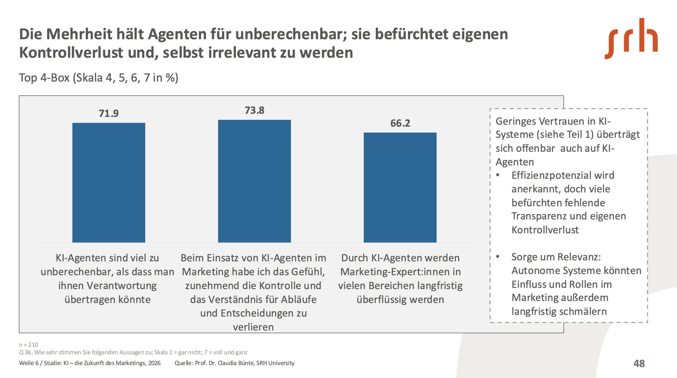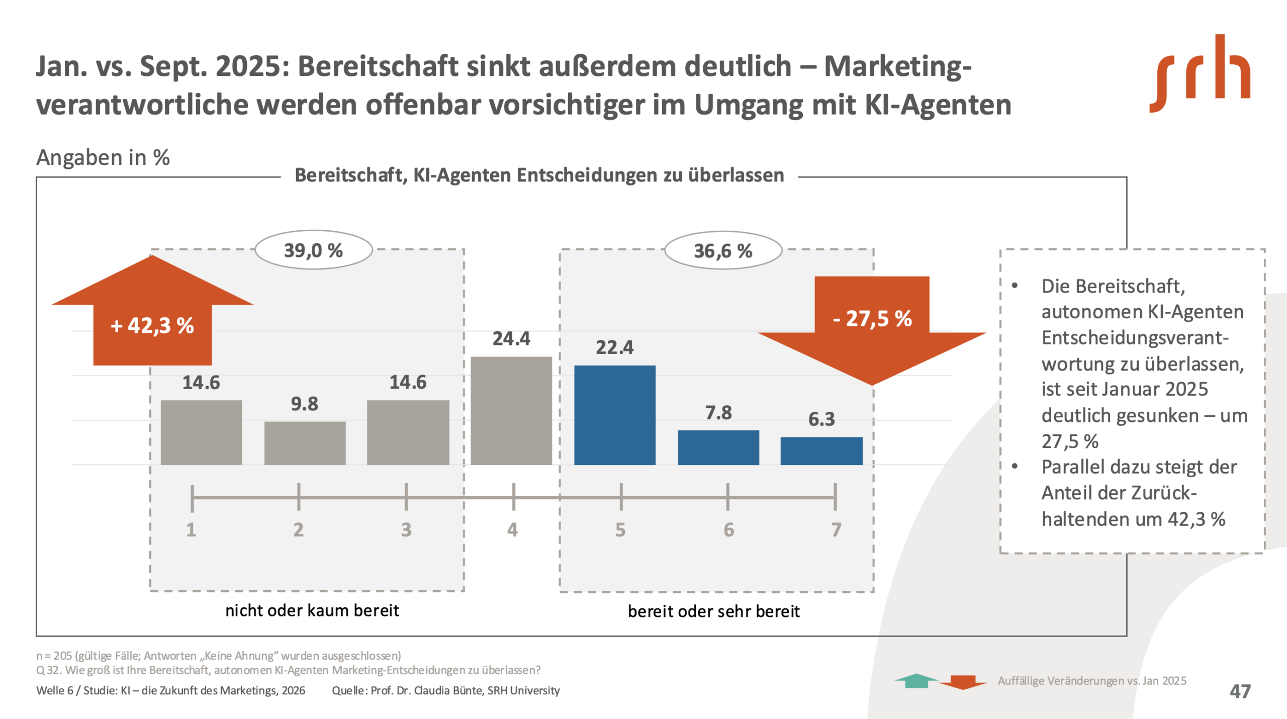 Obwohl KI-Agenten von vielen als deutlicher Effizienzgewinn eingeschätzt werden, bleibt die Bereitschaft gering, Verantwortung an sie abzugeben. Nur etwa ein Drittel würde dies aktuell tun, und der Wert ist seit Januar 2025 deutlich gesunken – um 27,5 %. Ein Hauptgrund: Marketingverantwortliche empfinden KI-Agenten als schwer berechenbar, fürchten Kontrollverlust und machen sich Sorgen um die eigene Rolle im Marketing – sie fürchten, irrelevant zu werden. Die Zurückhaltung könnte ein Hinweis darauf sein, dass viele Anwender:innen die höheren Anforderungen und Risiken autonomer Systeme bereits intuitiv erkennen – und sich (noch) nicht ausreichend sicher fühlen, um Verantwortung zu übertragen.