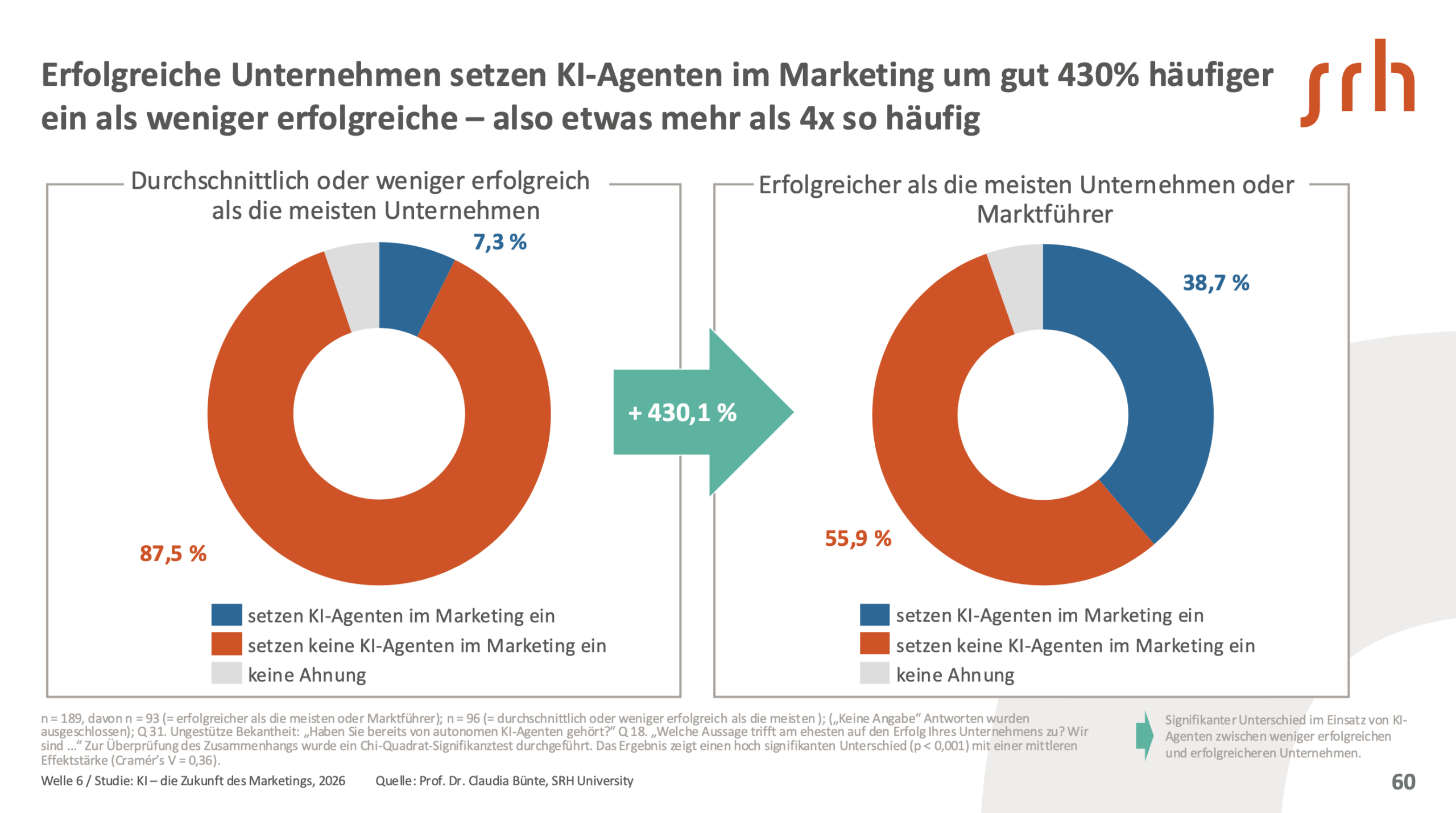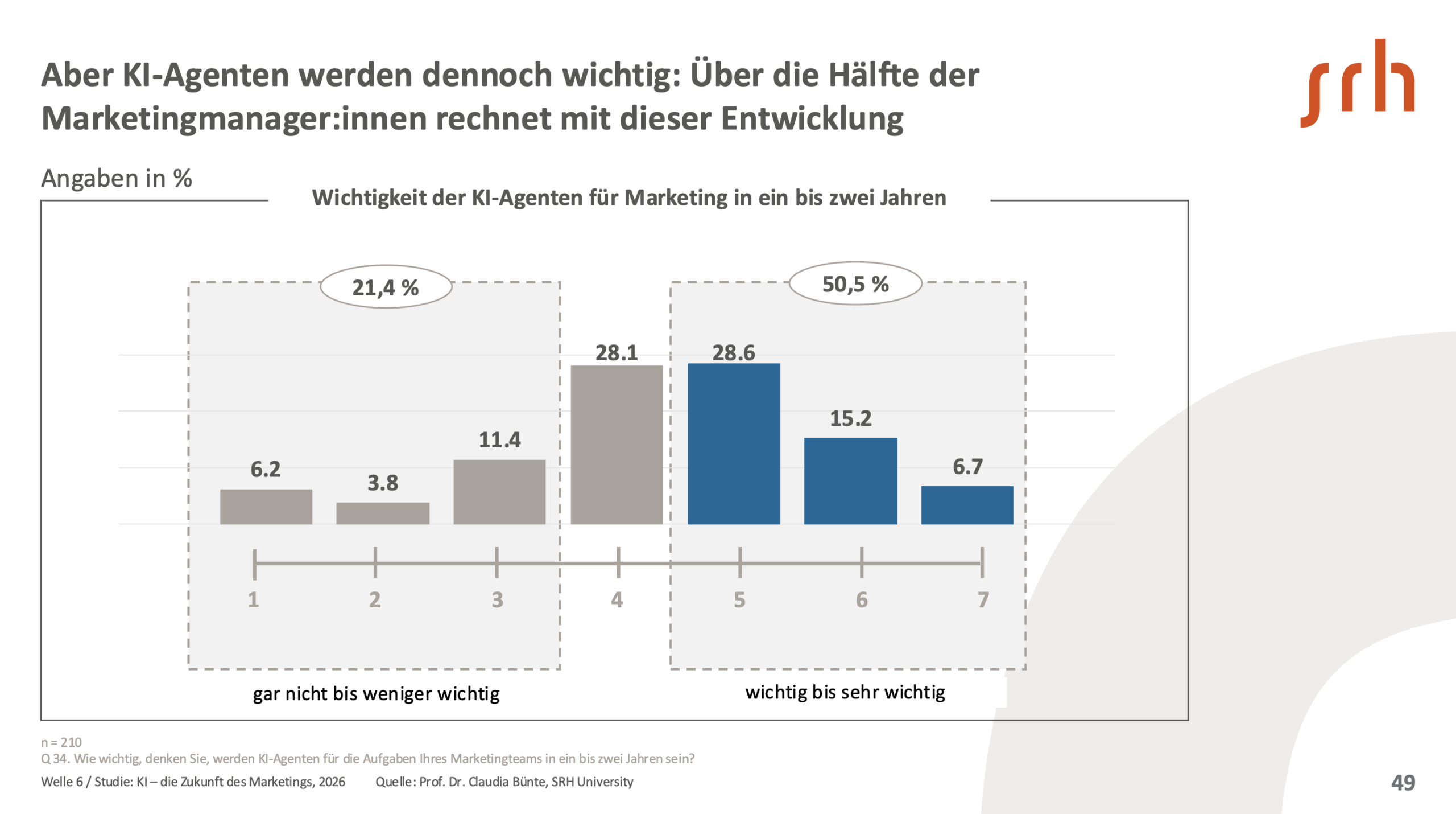 Dort, wo KI-Agenten im Marketing bereits eingesetzt werden, steigt der wahrgenommene Mehrwert deutlich, ebenso die Bereitschaft zur Delegation. Erfolgreiche Unternehmen sind KI-Agenten deutlich näher: Sie beschäftigen mehr Marketingexpert:innen, die mit dem Thema vertraut sind, nutzen KI-Agenten viermal häufiger als der Wettbewerb und halten sie deutlich öfter für wichtig in naher Zukunft. Entsprechend ist dort auch die Bereitschaft, Entscheidungen zu delegieren, doppelt so hoch.