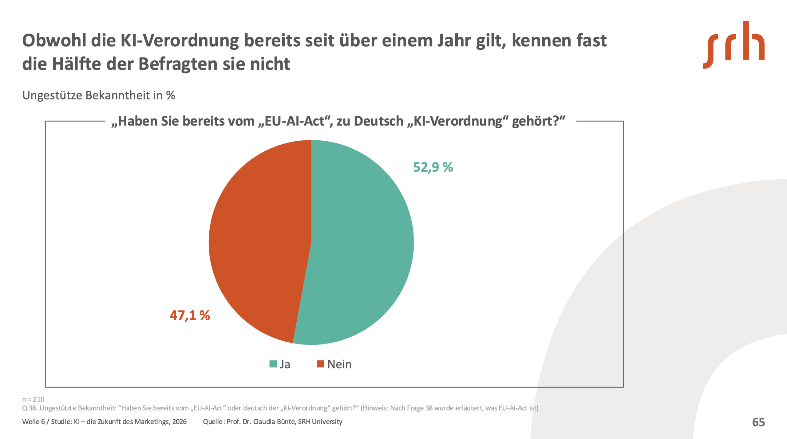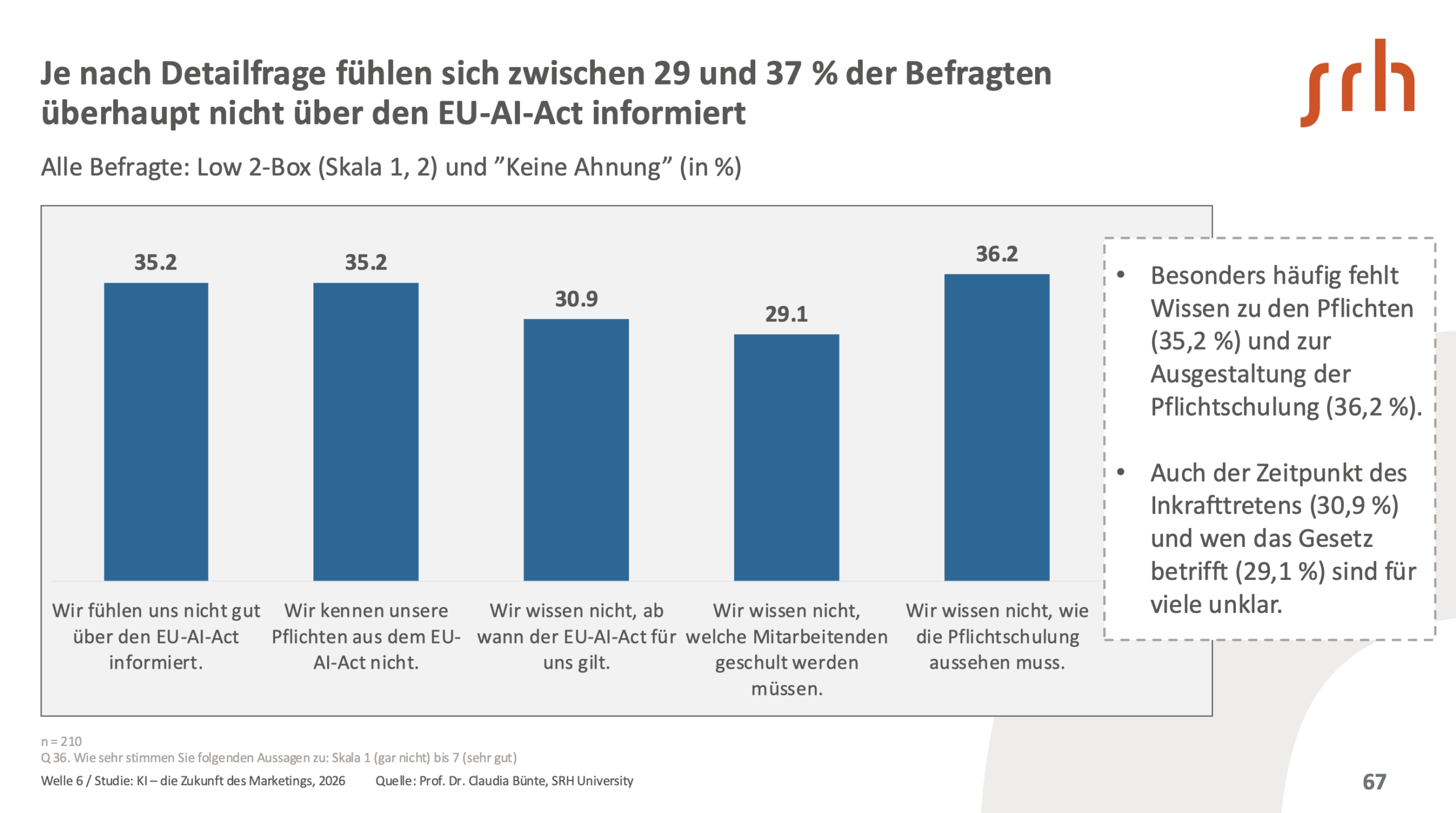 Obwohl die EU-KI-Verordnung seit über einem Jahr gilt, hat fast die Hälfte der Befragten noch nie von ihr gehört. Selbst unter jenen, die regelmäßig mit KI arbeiten, wissen 41 Prozent nicht, dass sie persönlich unmittelbar vom Gesetz betroffen sind. Auch die verpflichtende Schulung nach dem EU-AI-Act bleibt weitgehend unbeachtet: Nur 18 Prozent der Befragten haben sie absolviert, in Marketingteams lediglich neun Prozent. Unklarheit über Pflichten hemmt offenbar die Umsetzung der Schulungspflicht: 30,9 bis 36,2 % fühlen sich nicht ausreichend informiert.