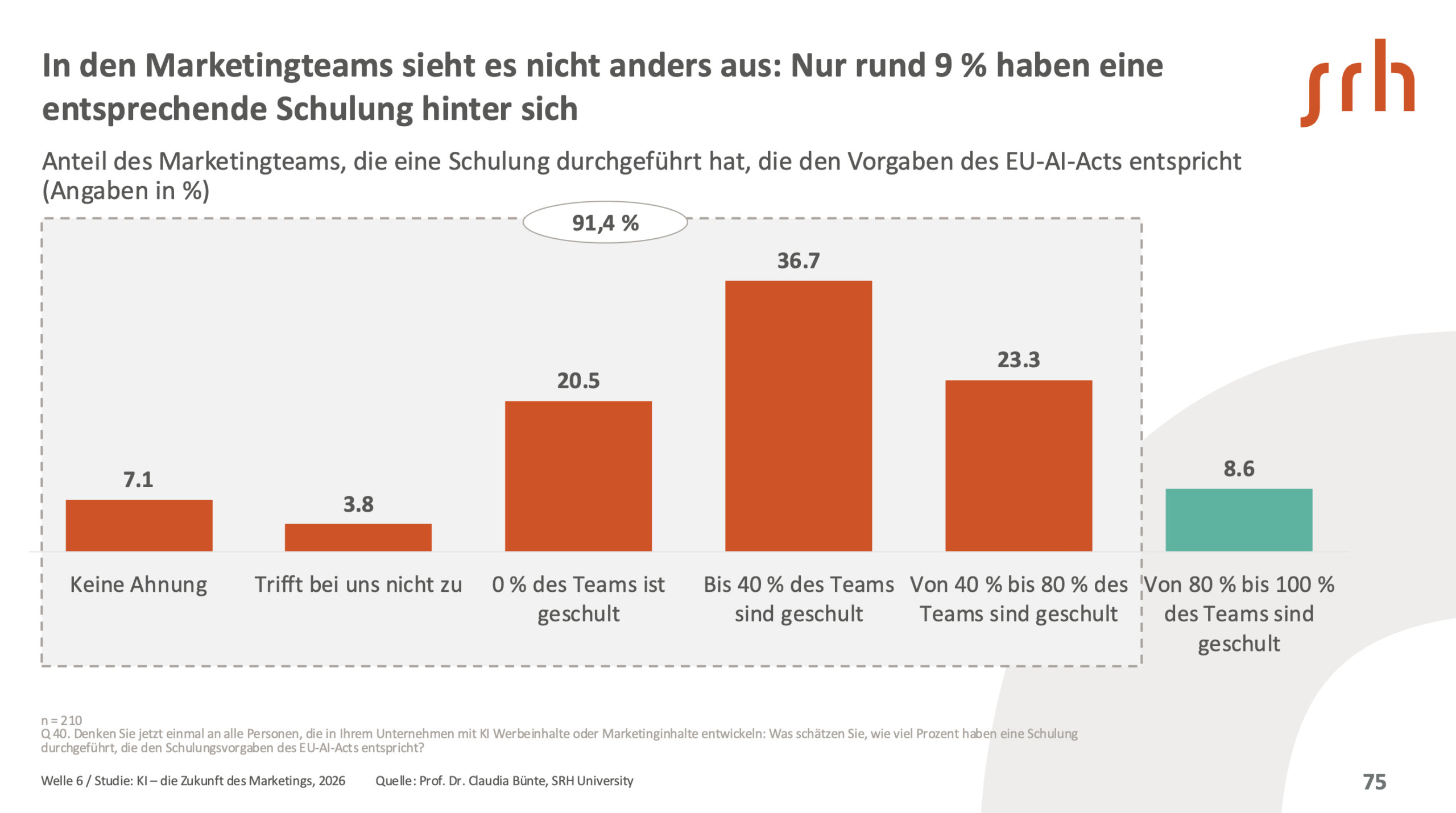 Der individuelle Kenntnisstand hält mit der technologischen Entwicklung nicht Schritt. 41,7 % der benötigten KI-Fähigkeiten fehlen weiterhin, und 81,9 % der Marketingteams gelten nicht als ausreichend geschult. Diese Lücke wirkt sich unmittelbar aus: Aufgrund fehlenden Wissens und unzureichender Weiterbildung bleibt aktuell fast ein Viertel des möglichen KI-Potenzials im Marketing ungenutzt.